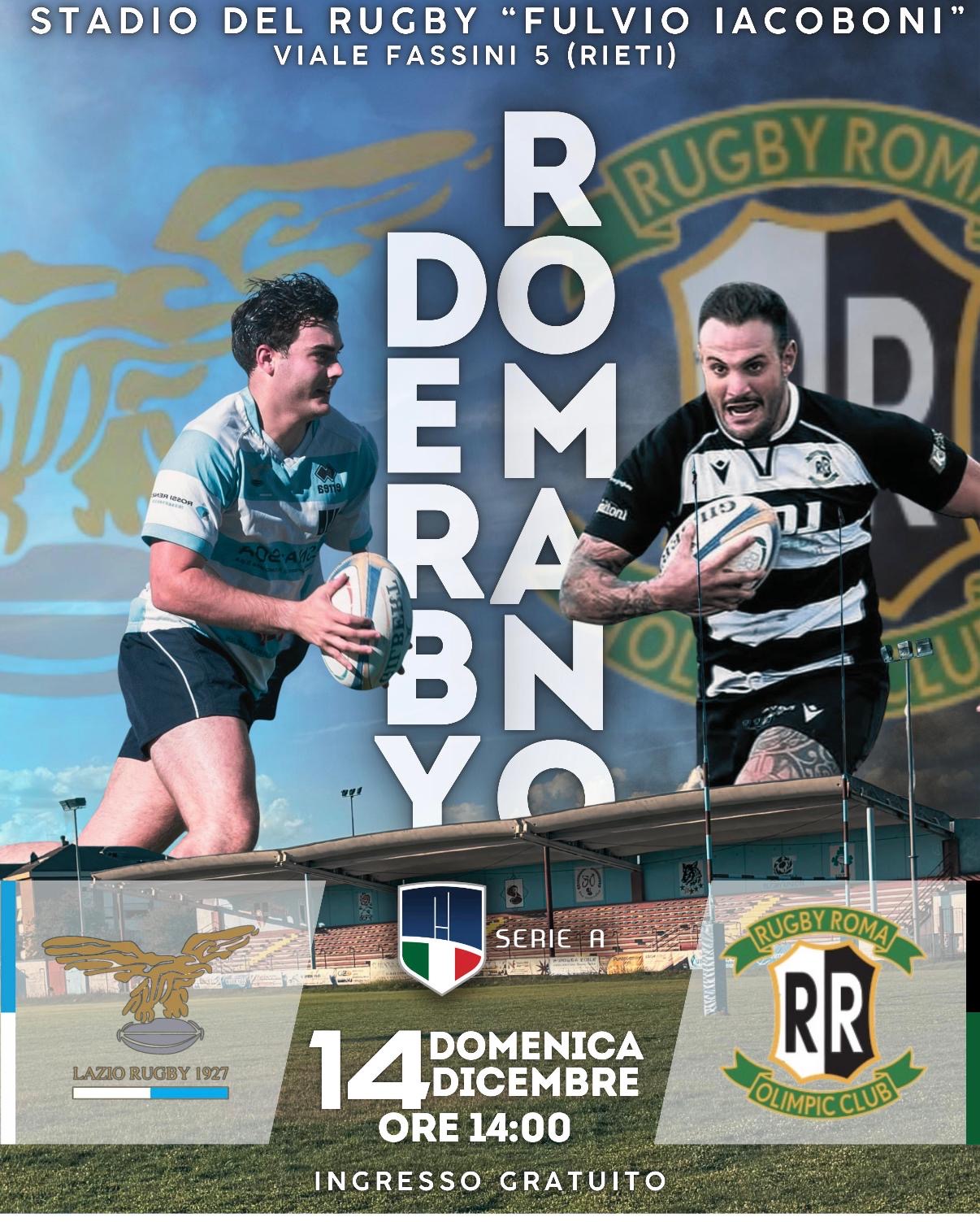 Domenica 14 dicembre alle ore 14, ingresso gratuito, il Fulvio Iacoboni di viale Fassini sarà teatro del derby di serie A2 tra Lazio e Rugby Roma.